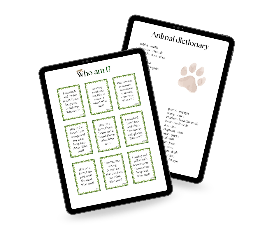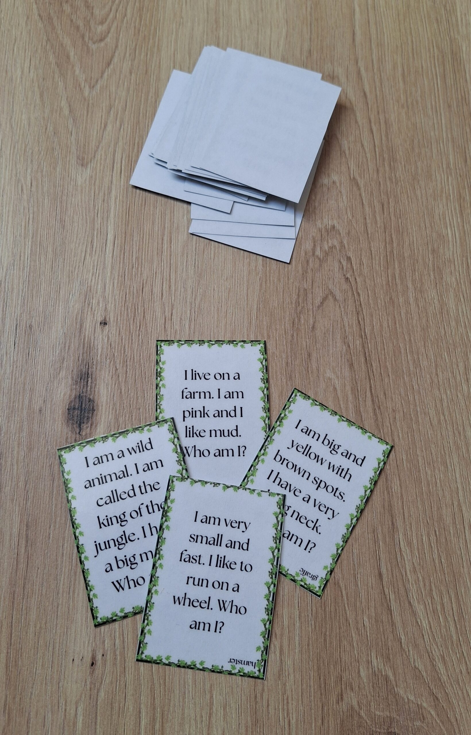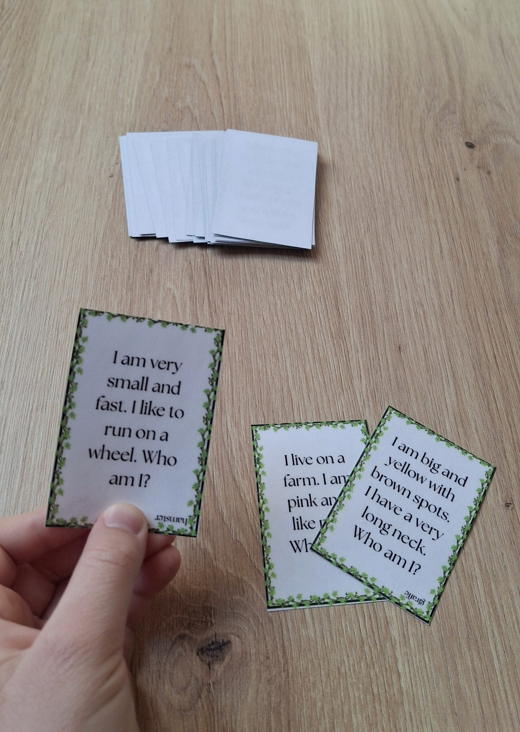 Zestaw zawiera 27 zagadek o zwierzętach zapisanych w języku angielskim. Zadaniem gracza jest wysłuchanie lub przeczytanie zagadki i odgadnięcie hasła. Jeśli pojawią się trudności, na karcie znajduje się dyskretna podpowiedź – rozwiązanie zapisane małym drukiem, odwrócone do góry nogami. Dzięki temu można samodzielnie sprawdzić odpowiedź bez przerywania zabawy.